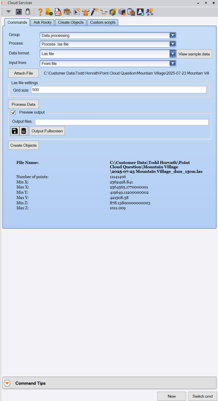 The Process LAS file command can be found in the Cloud Services - Commands Tab, under the Data processing Group, as Process “Process LAS File”. The command dialog looks as follows.