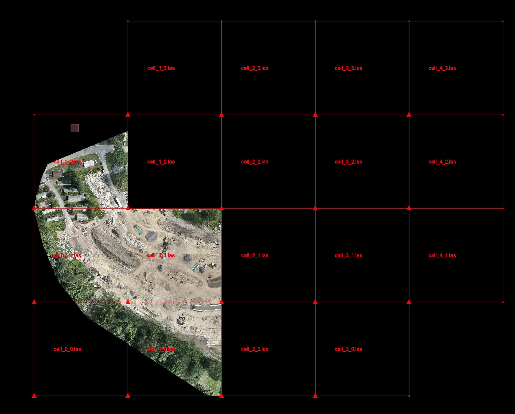 The command allows you to read the LAS file and turn it into multiple sub files of a user defined grid cell size, each file is named and mapped to a grid square that is drawn in the plan view, and labeled with the file name that correlates to the grid square. This means you just have to process the file once, create the sub files (which are not imported into TBC), and then you can import one of the sub files to check to see if you have the units, coordinate system, and Grid or Ground setting correct before you import the remainder of the files to complete the data set. If you have a file that is too large for your available processing power, you can import part of the project, use Point Cloud Processor or other TBC tools on the data to reduce it and then output the reduced point cloud(s) file to an external .las file (using the RPS LAS Export command) that can be later combined with other similar files for complete site processing.