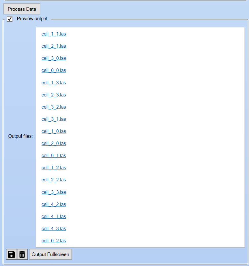 The output files list shows the list of the sub LAS files created by the process. The files are all created in the current projects project folder. the names of the files are correlated to the grid cells drawn in the plan view of the project