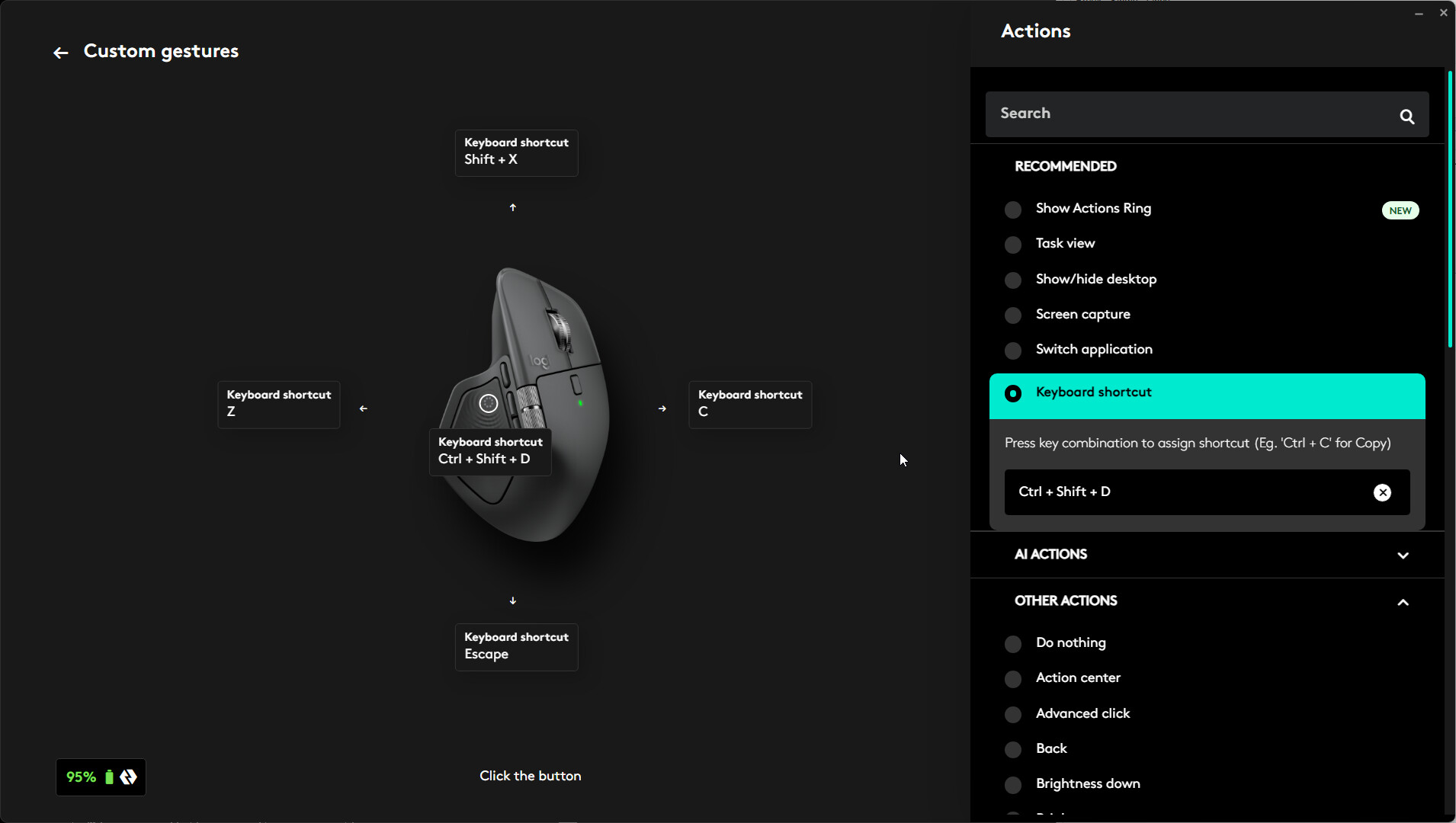 - You will now define the “Keyboard Shortcut” for each of the 5 options that you want to execute when you take that Click or Gesture Action. For the Click, click in the fild on the image that says Click. It will turn Green. On the right side, under RECOMMENDED, click Keyboard Shortcut. A field will then open and await the shortcut that you want to define. Use your keyboard to type CTRL + SHIFT + D the Shortcut we use for the RPS Navigate command (Radial Menu)., with the window still open, repeat for the 4 Gestures.