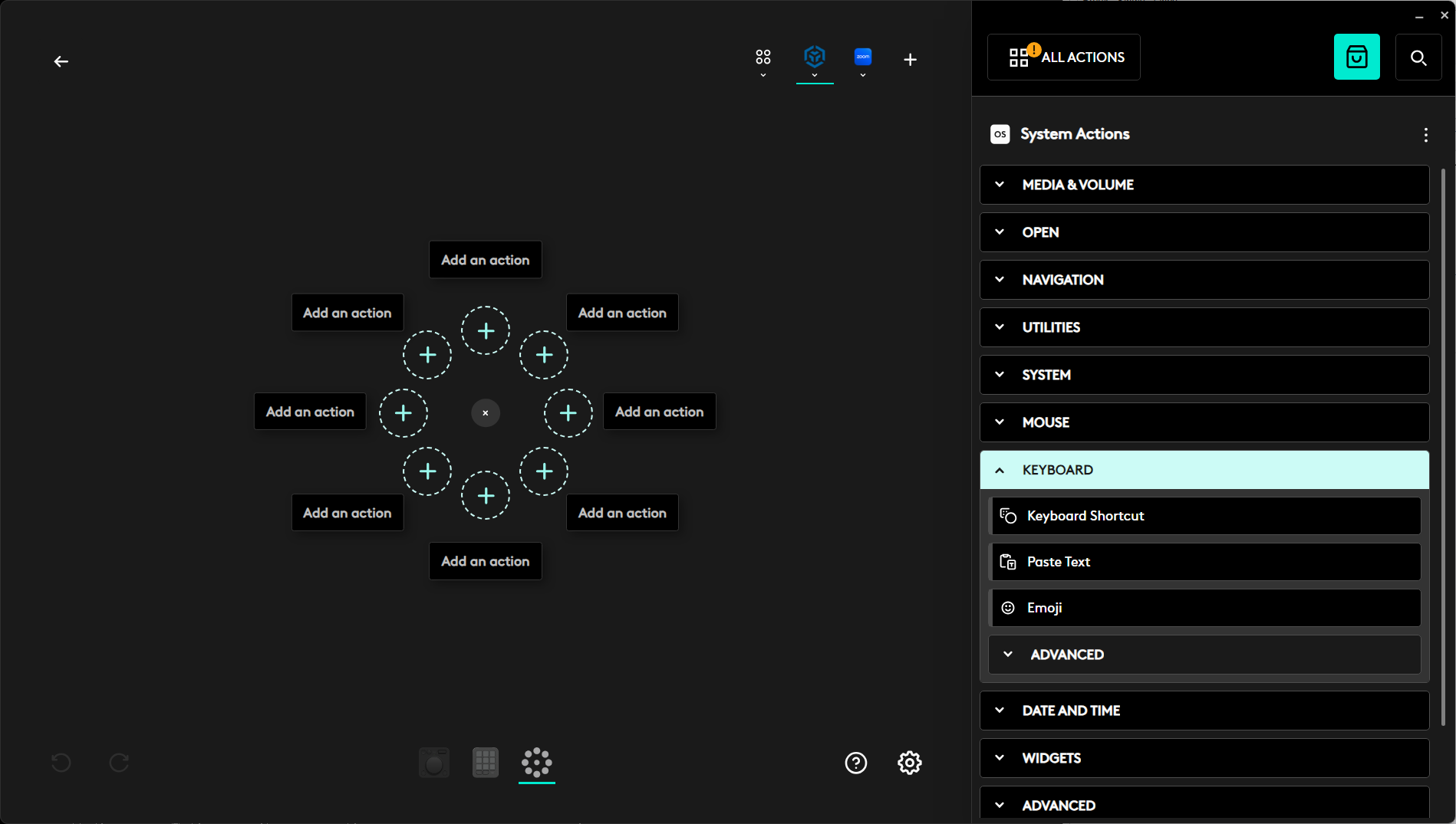 - The Action Ring has 8 available spots. Each Spot can be programmed as a command or as a Folder. To select whether you are creating an Action (Keyboard Shortcut) or a Folder (a group of commands under one button), click on the 3 dots button in the top right or left corner of the boxes that says Add an action for the button that you wish to program. Select from the three options