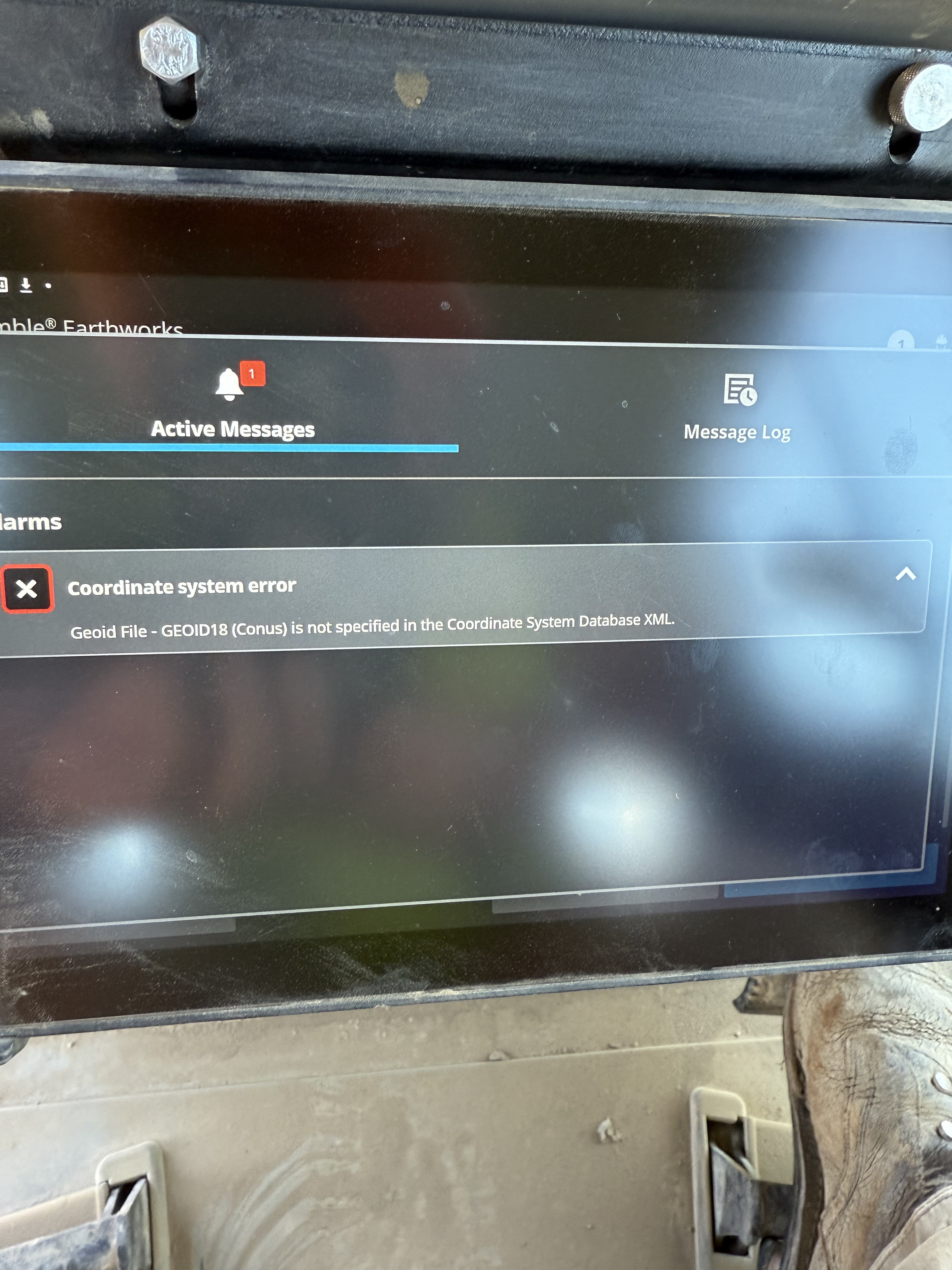 This error shows that the Geoid model used in your Calibration file is not present on the machine. To resolve this issue, you can copy the Geoid file from the TBC folder location on your computer. The default location of that file is the following.