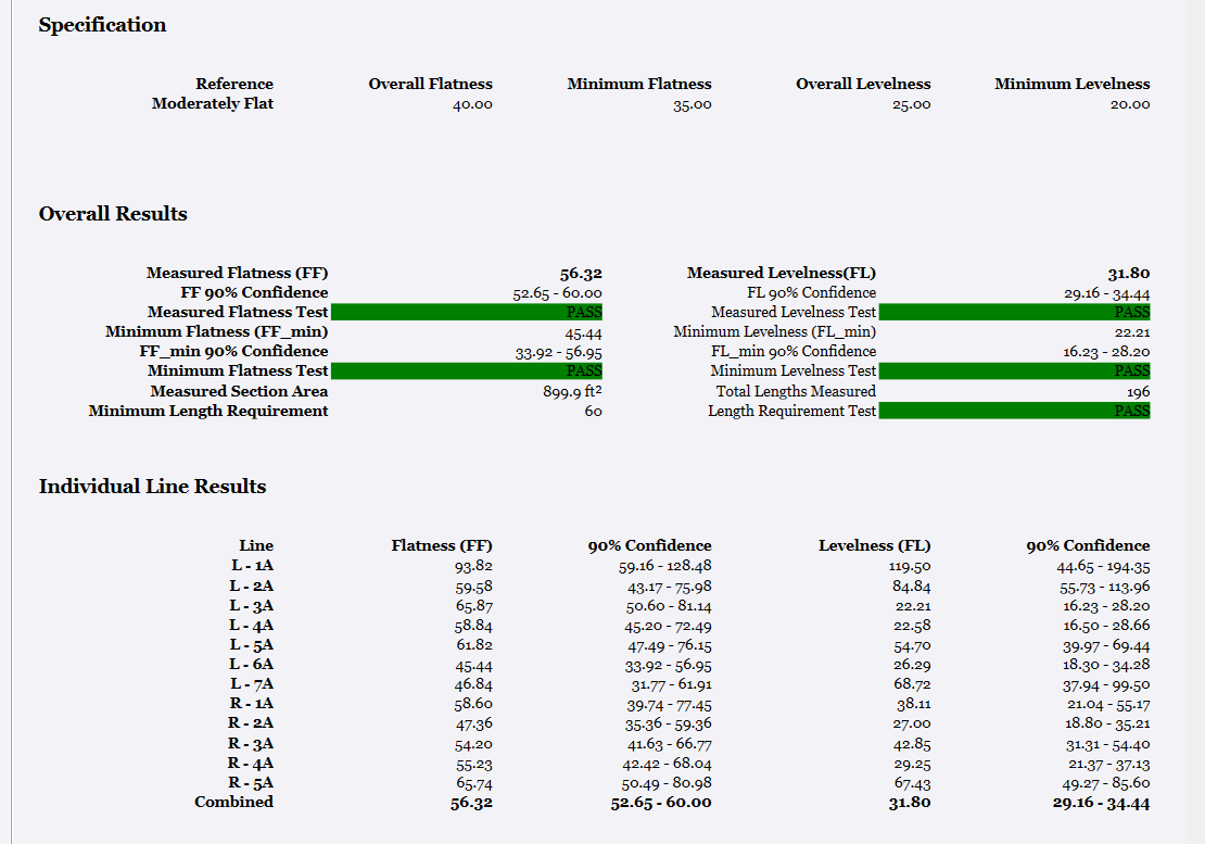 - Minimum Levelness Test - shows whether the achieved FL_min values passed or failed when compared to the specification definition.