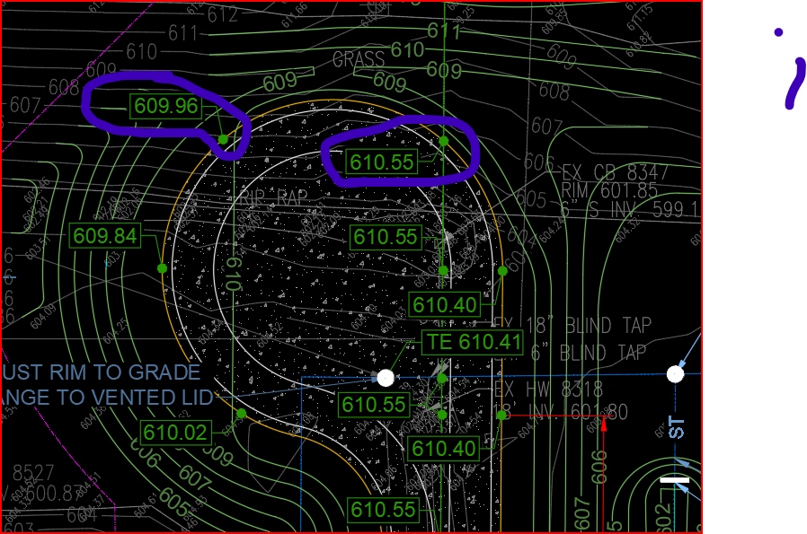 I have a cad file from the Civil designer. In the cad file there is a block with all the grading plan entities. In the AutoCAD drawing, the grading block has grade text call outs that are visible before and after expolding. When the drawing is imported into TBC the grade text call outs are no longer present. I usually open in autocad first and inspect so i know if the data was not sent or just not treated properly by TBC. See snap below. All of the colored object are part of the block the circled grade text is missing when imported to TBC.